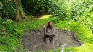 wearing my white summers dress, white socks and loafers i destroy my outfit by getting into my mudpit and getting completely covered in mud after i play in the mud i then rinse off under my garden hose.
