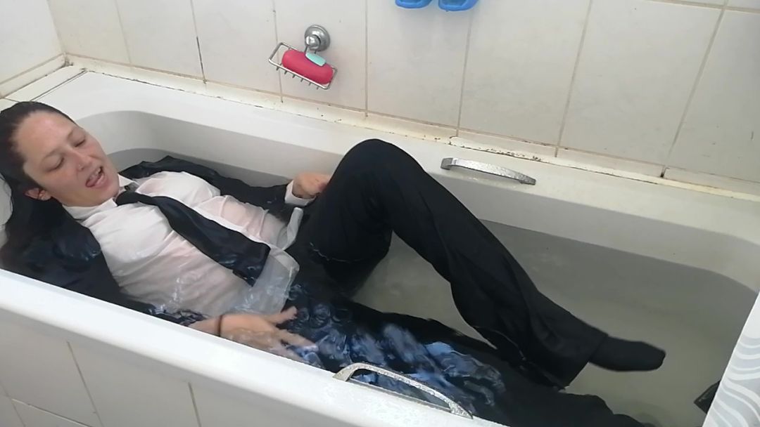 Wearing my business attire i get super soaking wet in my bathtub, just really enjoying how the water soaks every inch of my outfit. i enjoy showing off my super soaking socks.