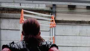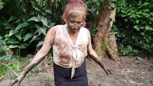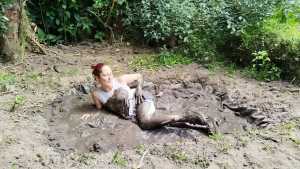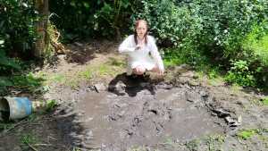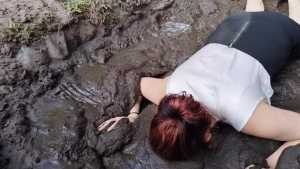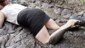 Wearing a skirt, heels and a blouse, this bratty uptight girl falls into mud pit face first. Not impressed at all.