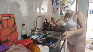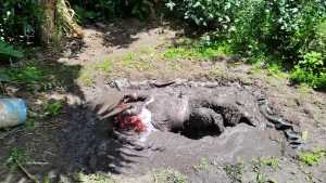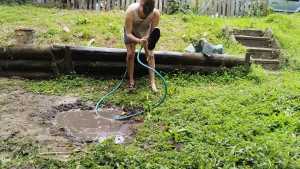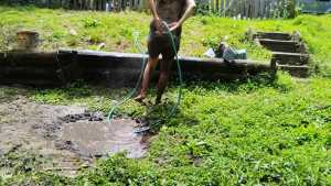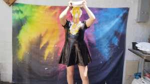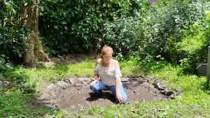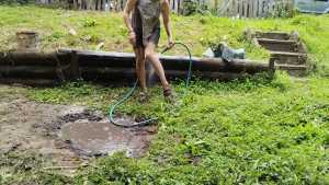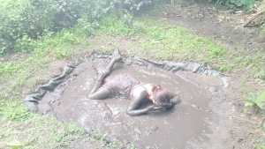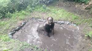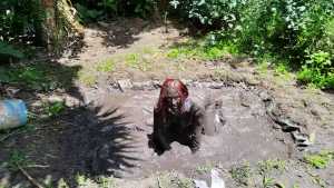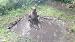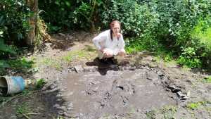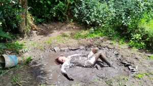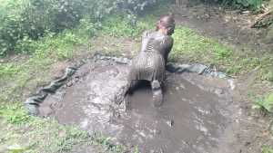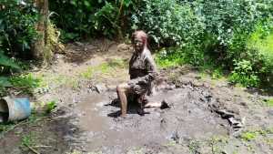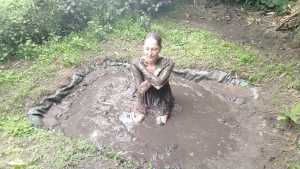Wearing a school uniform with pig tails i get super muddy in my mud pit.